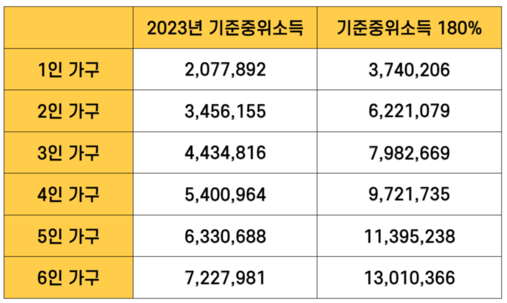 · 가구원 수에 따른 중위소득 180% 이하인 자