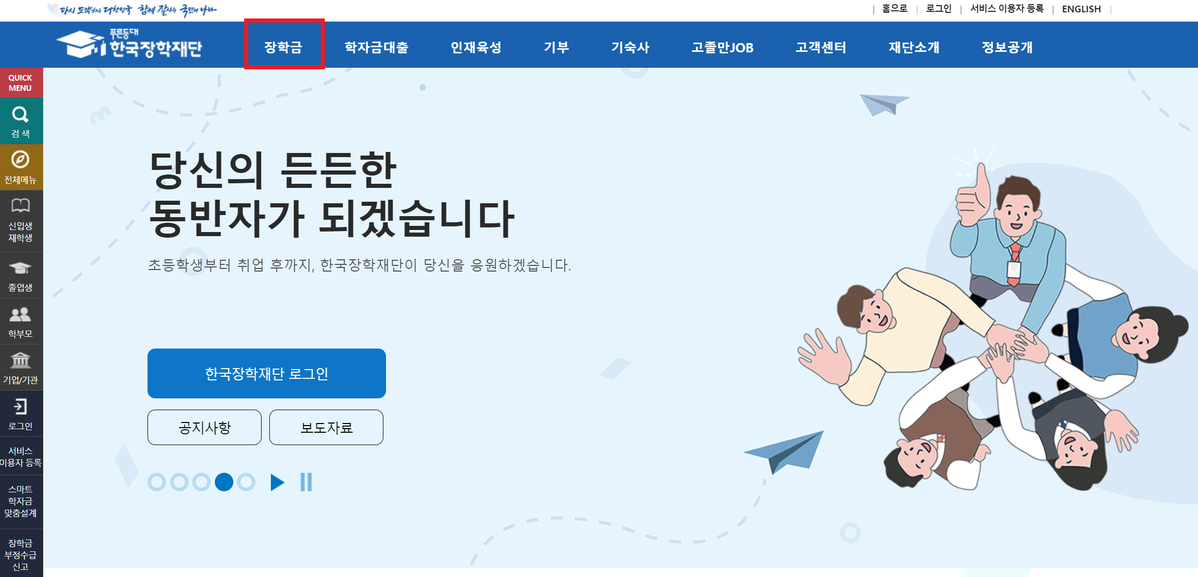 1. 한국장학재단 홈페이지에 접속하여 좌측상단 "장학금" 탭으로 이동합니다.