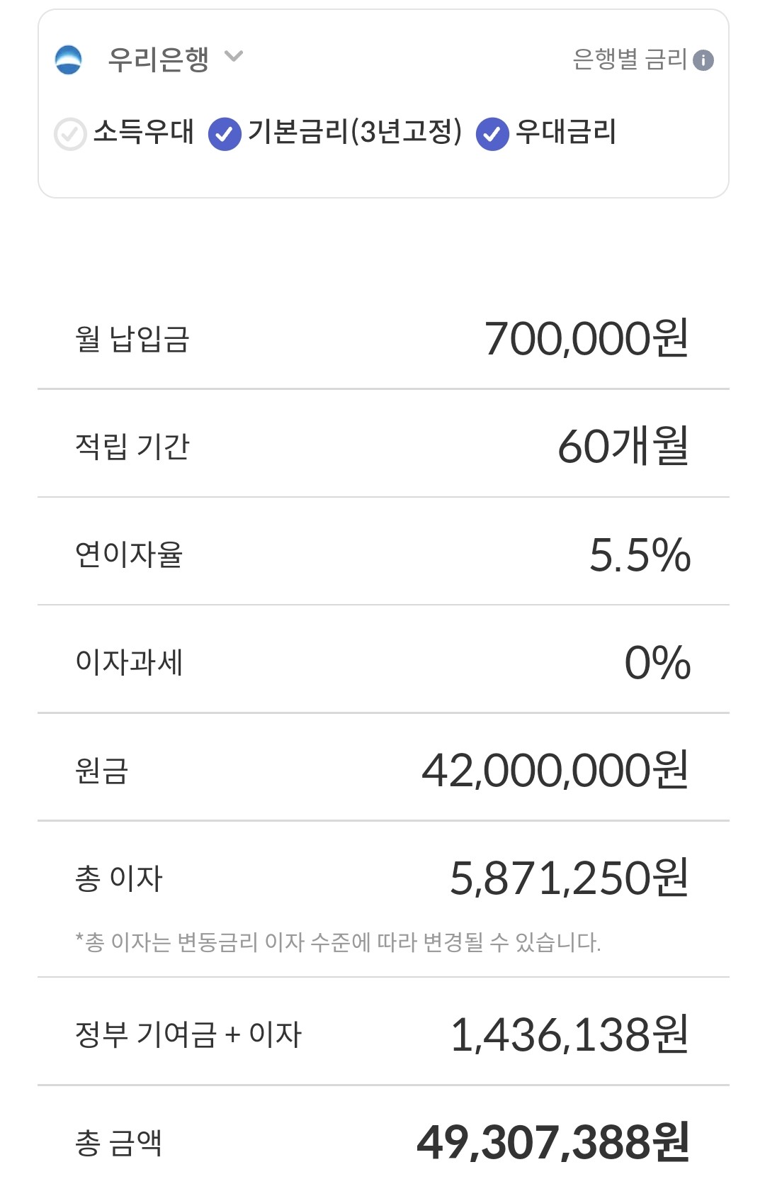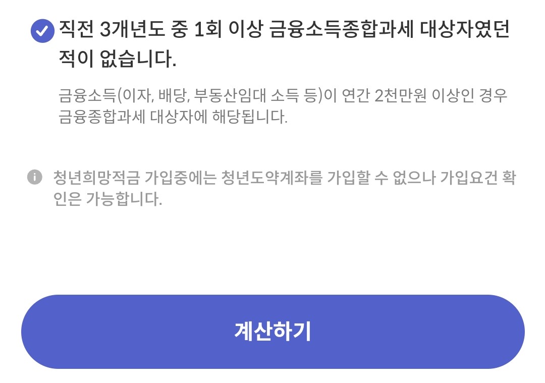 직전 3개년도 중 1회 이상 금융소득종합과세 대상 자였던지를 확인하고, 아래에 파란색 계산하기 버튼을 클릭하면 자동으로 계산됩니다. 청년희망적금 가입 중에는 청년도약계좌를 가입할 수 없으니 확인하시길 바랍니다.