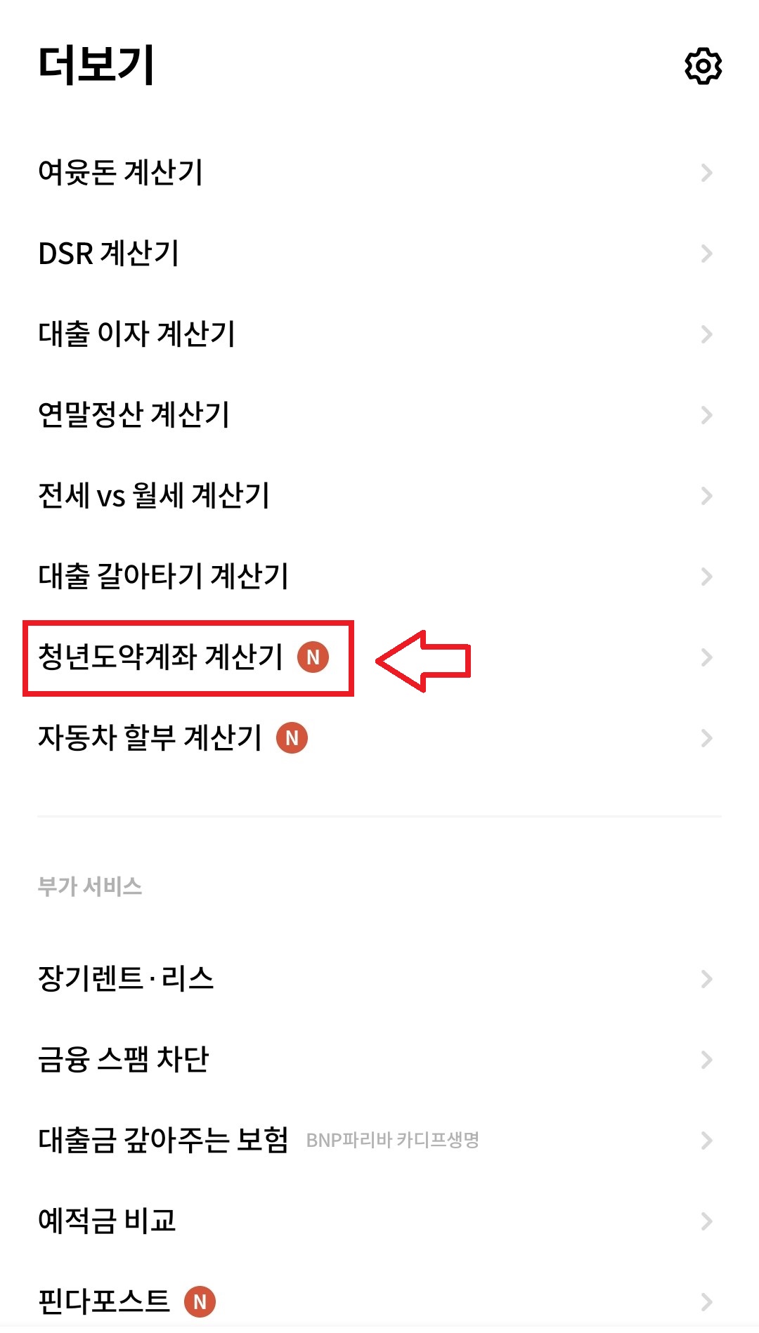 회원가입을 마치면 보이는 화면 오른쪽 하단에 "더보기"를 클릭합니다. 더보기로 들어오셔서 중간쯤으로 화면을 내리다 보면 "청년도약계좌 계산기"가 있습니다.