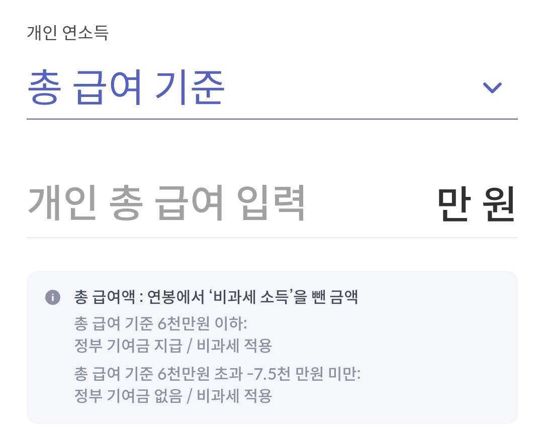 총 급여 기준 또는 종합 소득 기준으로 개인소득을 입력합니다. 자세한 총 급여액을 알아보는 방법은 국세청홈텍스에서 소득금액증명서('23.7월 이후 신청자의 경우, 22년도 기준확인) 내역을 확인하시면 됩니다. 만약에 '23년도 소득만 있으신 분은 '24년도 7월 이후에 신청할 수 있습니다.