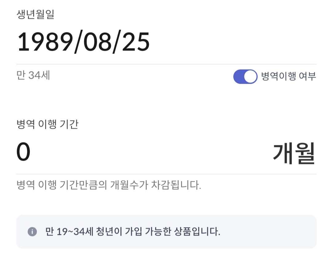청년도약계좌는 계좌개설일(가입일) 기준 만 19세~34세 이하만 가입이 가능합니다. 병역이행기간은 최대 6년까지 연령 계산 시 차감하고 계산하니, 해당하시는 분들은 반드시 입력하시길 바랍니다.