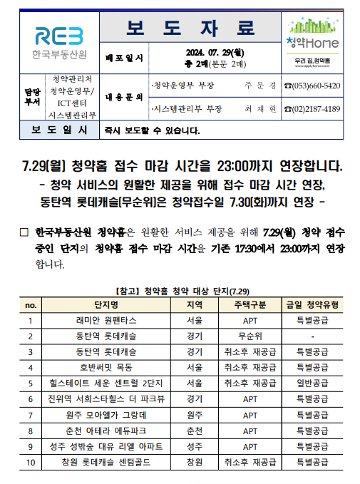 7월29일(월) 청약접수 기존 17:30 → 23:00 연장