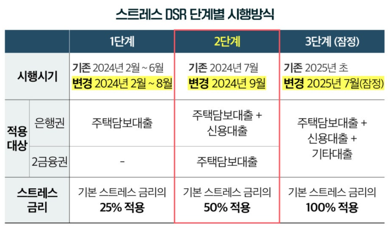 2024년 9월1일부터 스트레스 DSR(총부채원리금상환비율) 2단계 조치를 시행할 계획이라고 발표했습니다.
